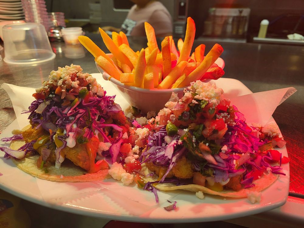 2 soft flour tortillas filled with grilled tilapia, pico de gallo, cilantro, and Jack cheese. Served with rice and beans.