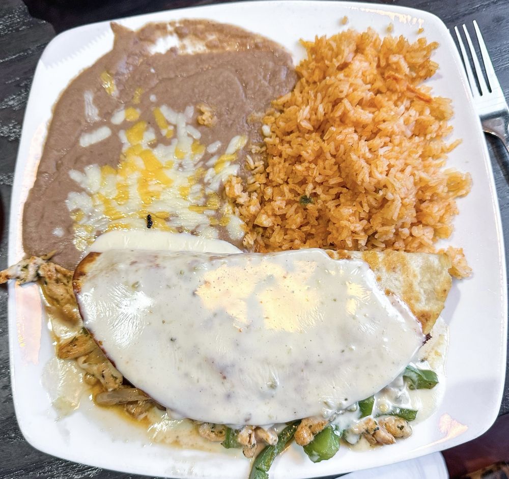A flour tortilla stuffed with cheese and a choice of fajita chicken or steak cooked with onions, bell peppers, and tomato, topped with cheese sauce. Served with rice and beans.